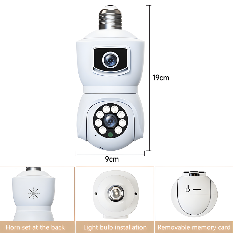 The V380 E9 Dual Lens Bulb Camera is a next-generation bulb camera designed for effortless installation and powerful surveillance. Simply screw it into a standard bulb holder and enjoy full-room coverage with advanced smart features—no drilling, no wiring, no hassle.